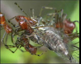 99% des araignées sont solitaires. Il existe pourtant quelques rares espèces sociales dans les régions équatoriales. Contrairement à la majorité des insectes sociaux, ces sociétés d'araignées ne renferment pas de castes. Ni roi ni reine, ni soldats ni ouvriers. L'organisation de ces sociétés semble anarchique. Le film souligne d'abord le caractère solitaire des araignées, puis illustre le phénomène social en utilisant une espèce de Guyane, Anelosimus eximius, qui ne mesure que 5 mm mais construit des pièges pouvant atteindre un volume de 1000 m3. La variabilité dans la taille et la forme de ces pièges soyeux et l'impression de confusion que dégagent les scènes de capture des proies suggèrent le chaos. Comment expliquer le fonctionnement harmonieux de cette société d'apparence anarchique ? La soie joue un rôle essentiel en coordonnant les activités des individus. Les araignées sont ainsi capables de maîtriser des proies 700 fois plus lourdes qu'elles. Réseau soyeux, tolérance, mais aussi individualisme, sont les maîtres mots de ces sociétés. |